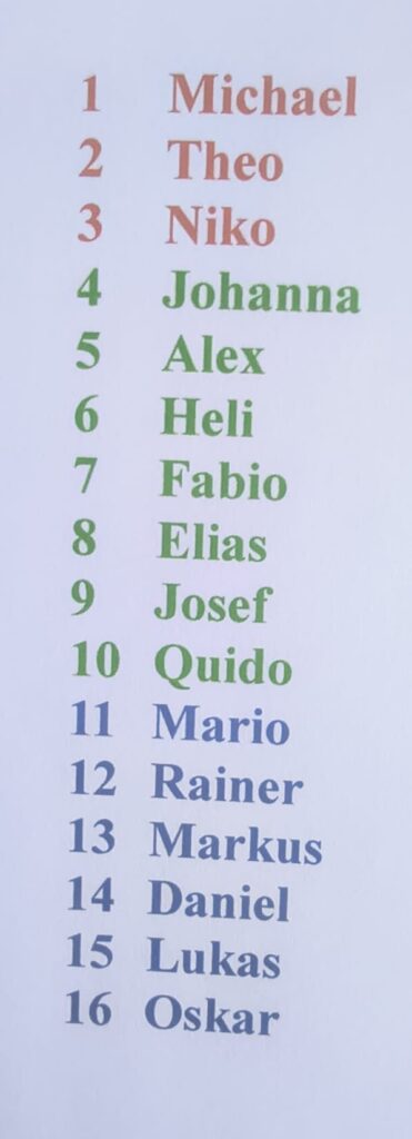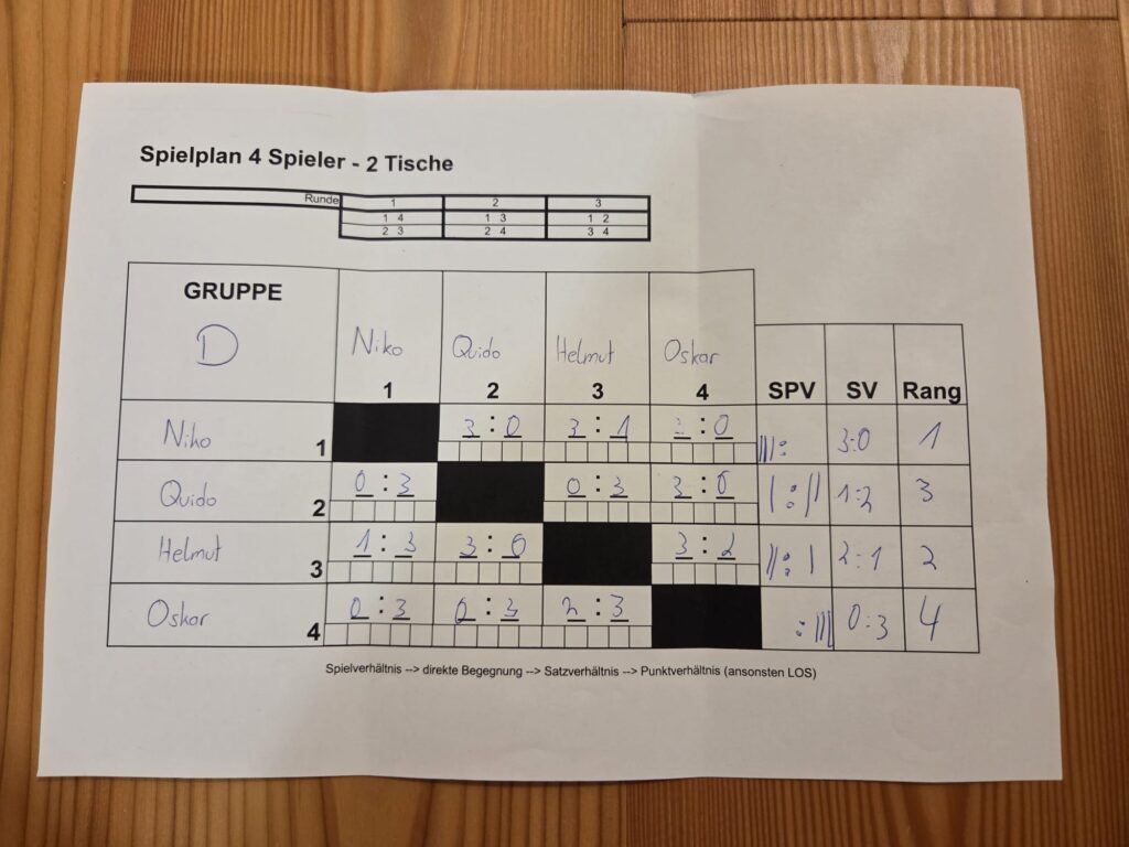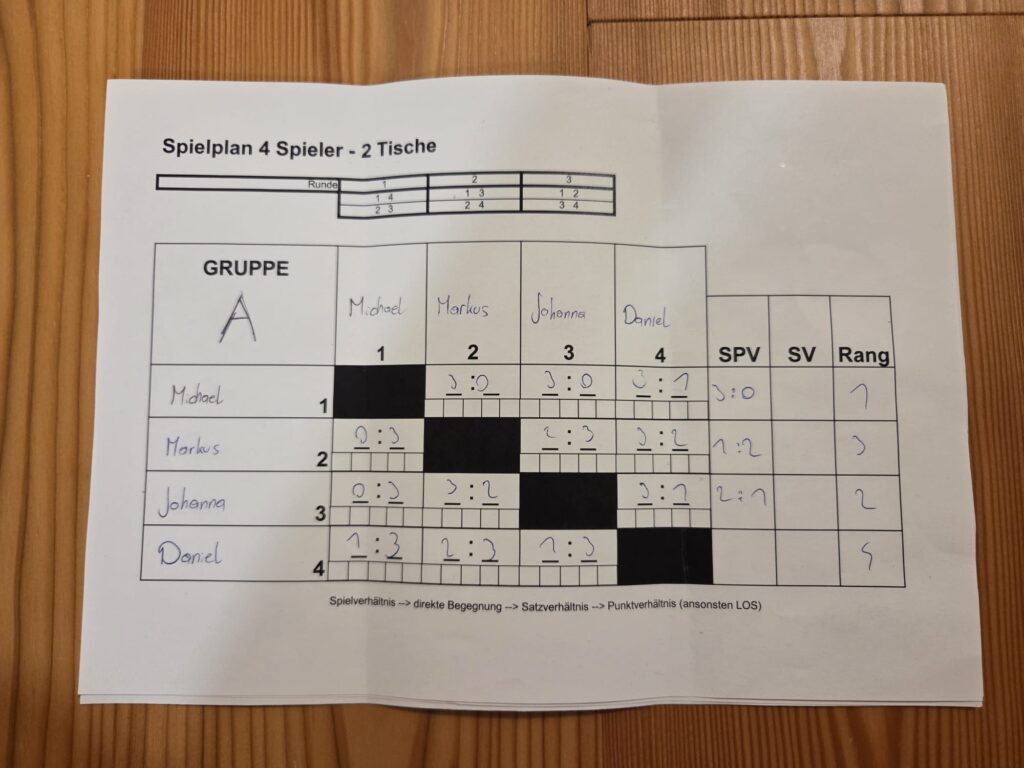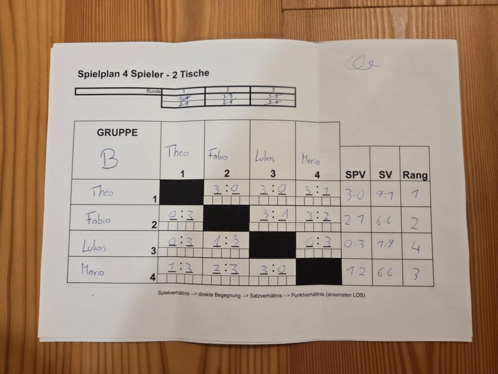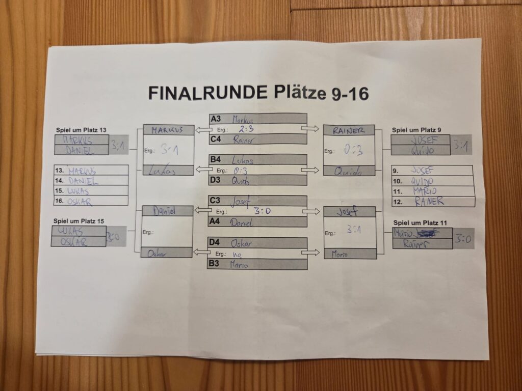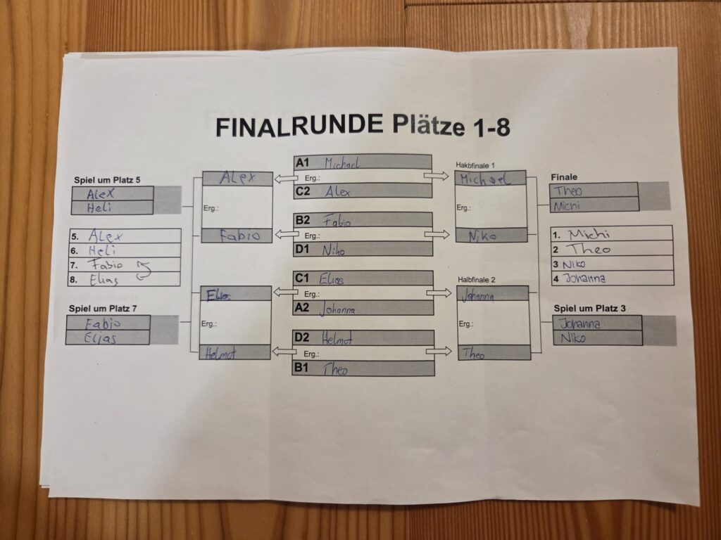 Die Überrraschung des Tages war Johanna, sie gewann in der Vorrunde gegen Markus und Daniel und eliminierte in der Hauptrunde sogar noch Elias bis Theo und Niko (Rang 3) ihren Siegesrun stoppte, was am Ende der 4. Rang bedeutete!!