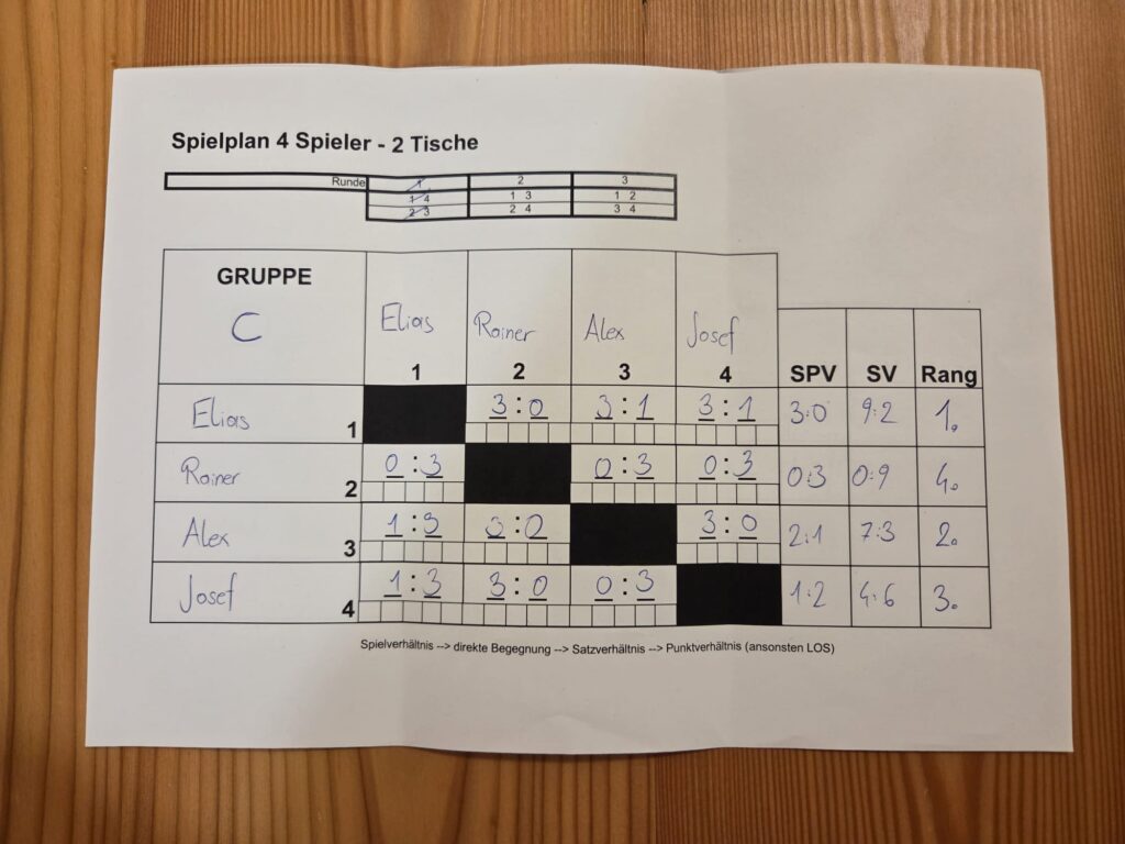 Ebenso überraschend Alex, (mit seinem neuen Anti) er bezwang in der Vorrunde Josef und Rainer klar, mußte leider in der Hauptrunde gegen Michael die Segel streichen, sicherte sich aber dennoch durch ein 3:0 gegen Fabio den ausgezeichneten 5. Rang!
